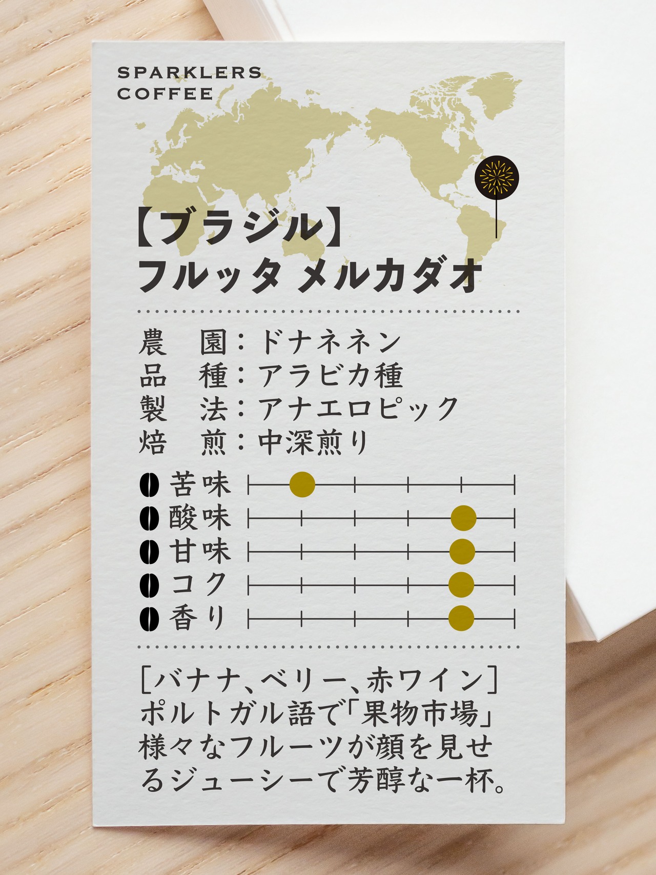ブラジルでは珍しいアナエロビック製法により、赤ワイン、バナナなどの複雑な果実感と、発酵由来の甘みが絶妙に調和しています。滑らかな口当たりと長く続く余韻も魅力的です。